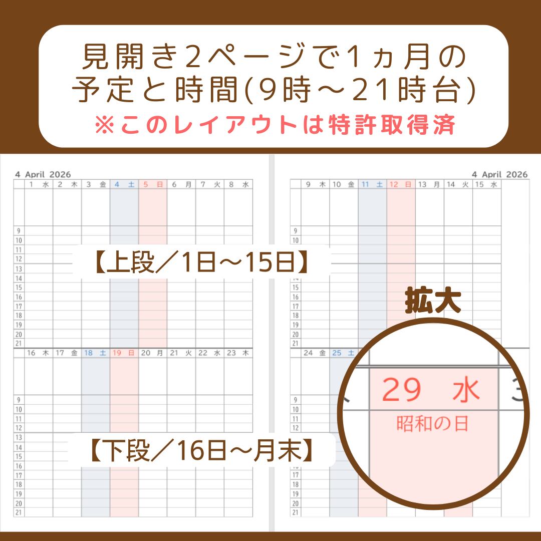 ・見開き2ページで1か月分のブロックと時間枠(9時~21時台)